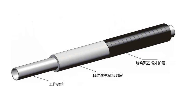 “聚氨酯喷涂聚乙烯缠绕预制直埋保温管” 由工作钢管、喷涂聚氨酯保温层、挤出聚乙烯外护层组成。保温层厚度和外护层厚度在生产时可以根据需要在一定范围内任意调整。可根据集中供热和供冷中介质的参数和
